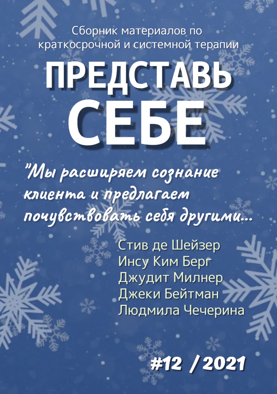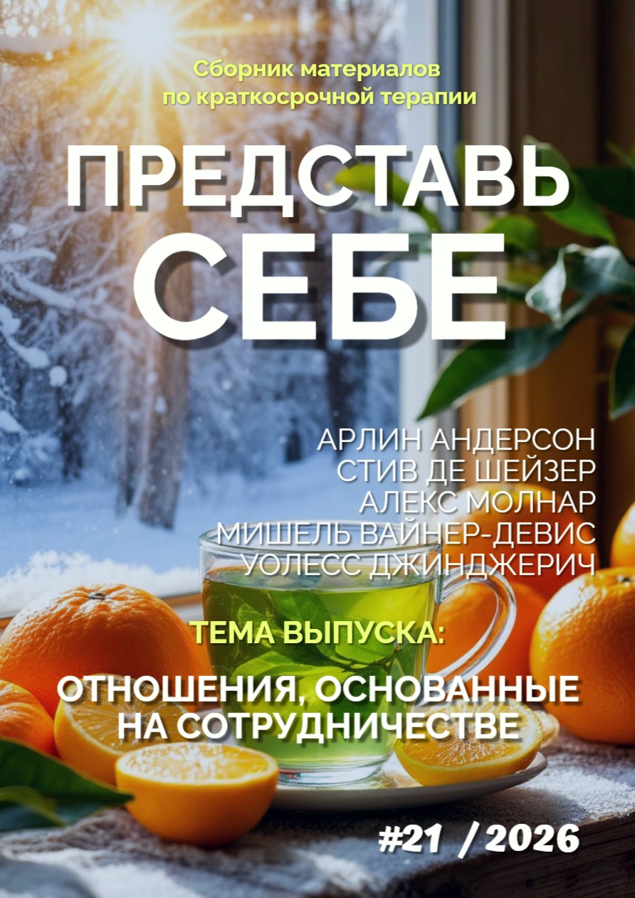 Электронный журнал (Сборник материалов по краткосрочной и системной терапии) "ПРЕДСТАВЬ СЕБЕ" создан в декабре 2018 г. В разное время в подготовке журнала принимали участие Гамзин Юрий, Елена Лаврова, Софья Киселева, Виктория Никитина, Мария Шут, Оксана Мушникова, Евгения Куминская, Маргарита Кевац, Людмила Чечерина, Елена Щербина, Александр Пасечный, Ольга Хохлова, Виктор Богомолов, Анна Соколова, Галина Иванова, Александр Селин, Анатолий Акимов, Елена Денисова, Олеся Зайко, Таллина Адамовская, Донькина Юлия,